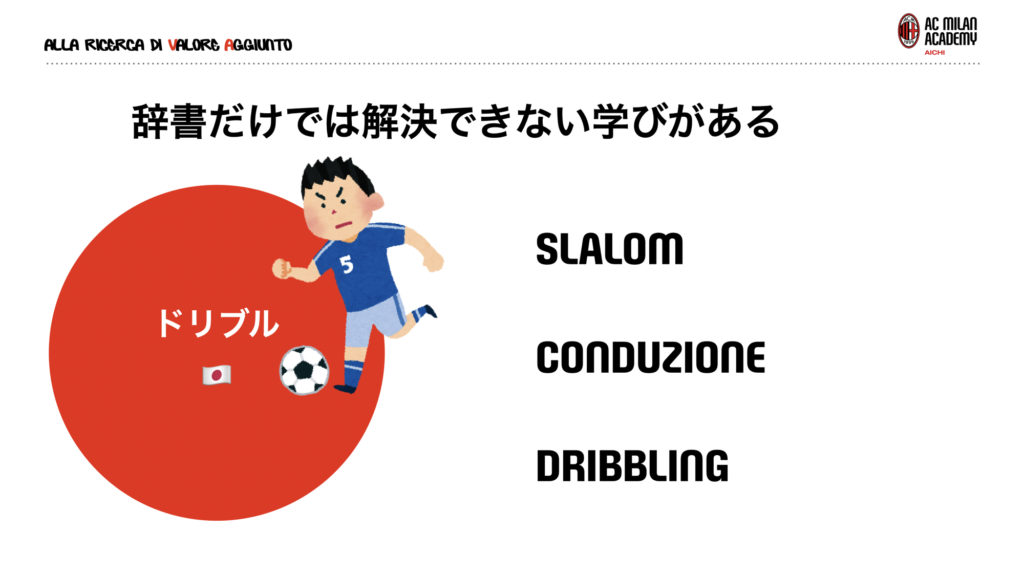 日本語では相手を抜くにしてもボールを運ぶにしても、ひとつの言葉で総称として捉えられる。